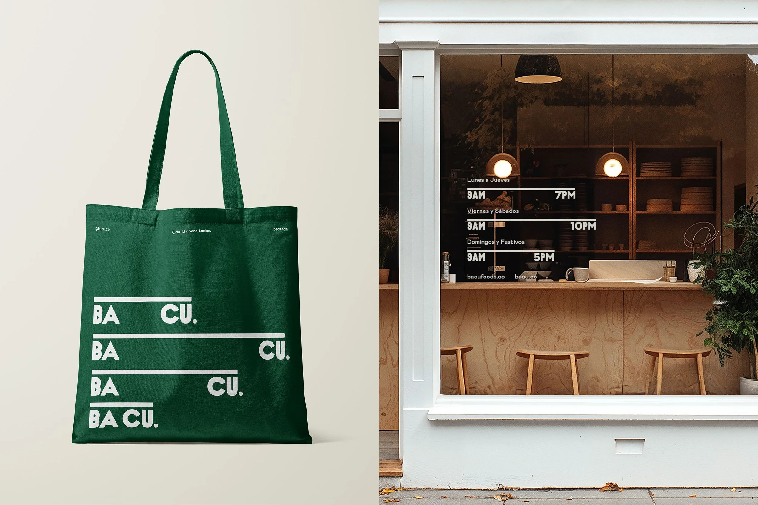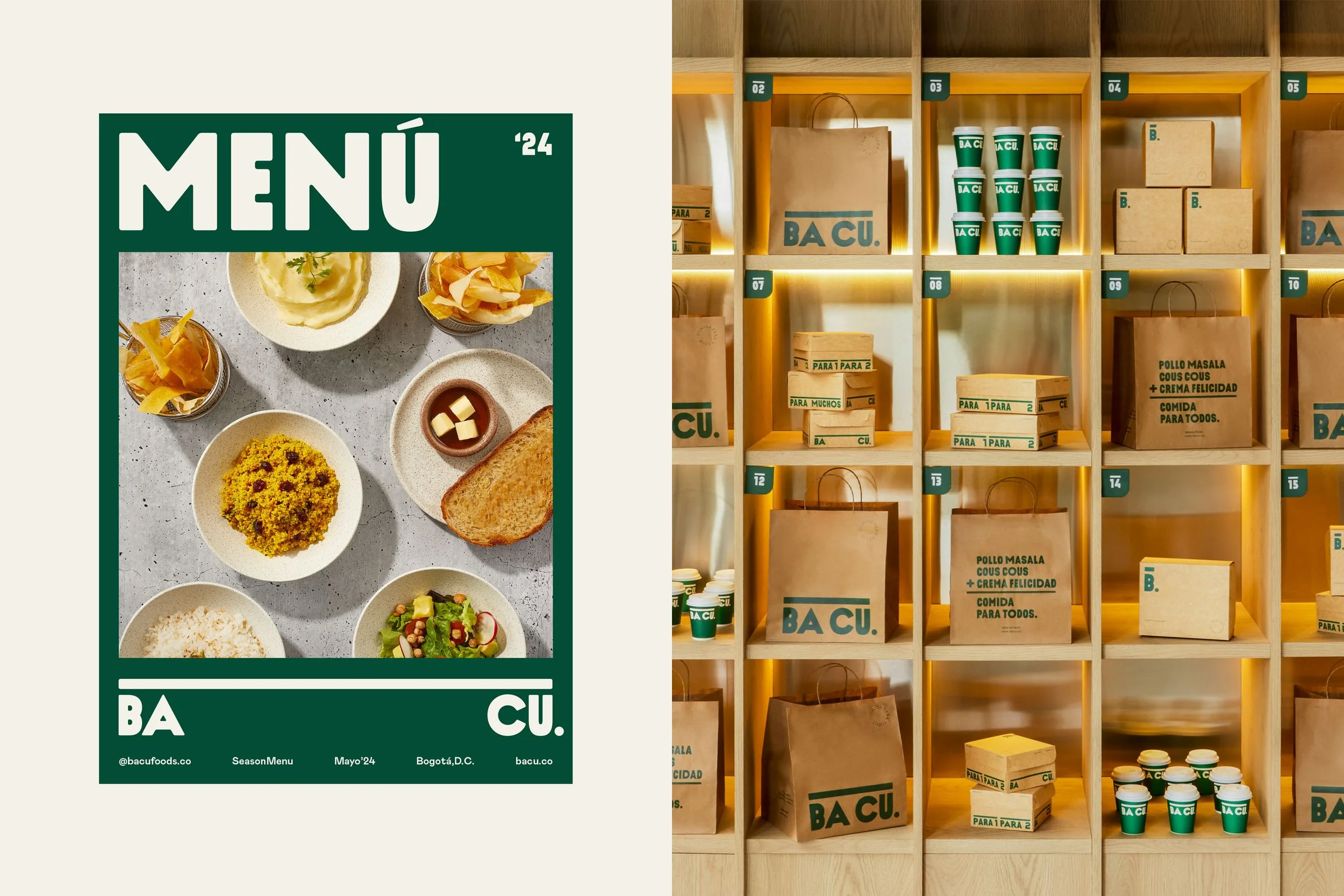 Bacu is a restaurant that welcomes everyone with a laid-back and unpretentious vibe, aiming to make quality food accessible to all in Colombia. The visual identity is inspired by the concept 'everyone’s table' which is reflected in a logo that expands to create space for all. The visual system is simple and pragmatic, it focuses on inviting messages, aiming to establish Bacu as the city's casual dining spot. The green color not only stands out but also brings a sense of vibrancy and comfort to the gray streets of Bogotá.